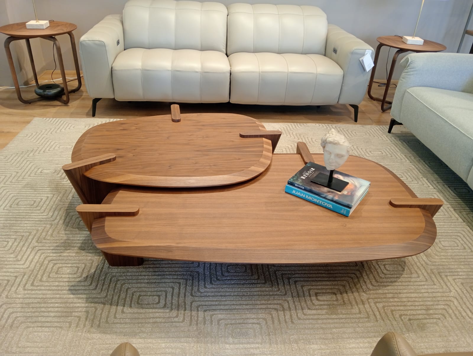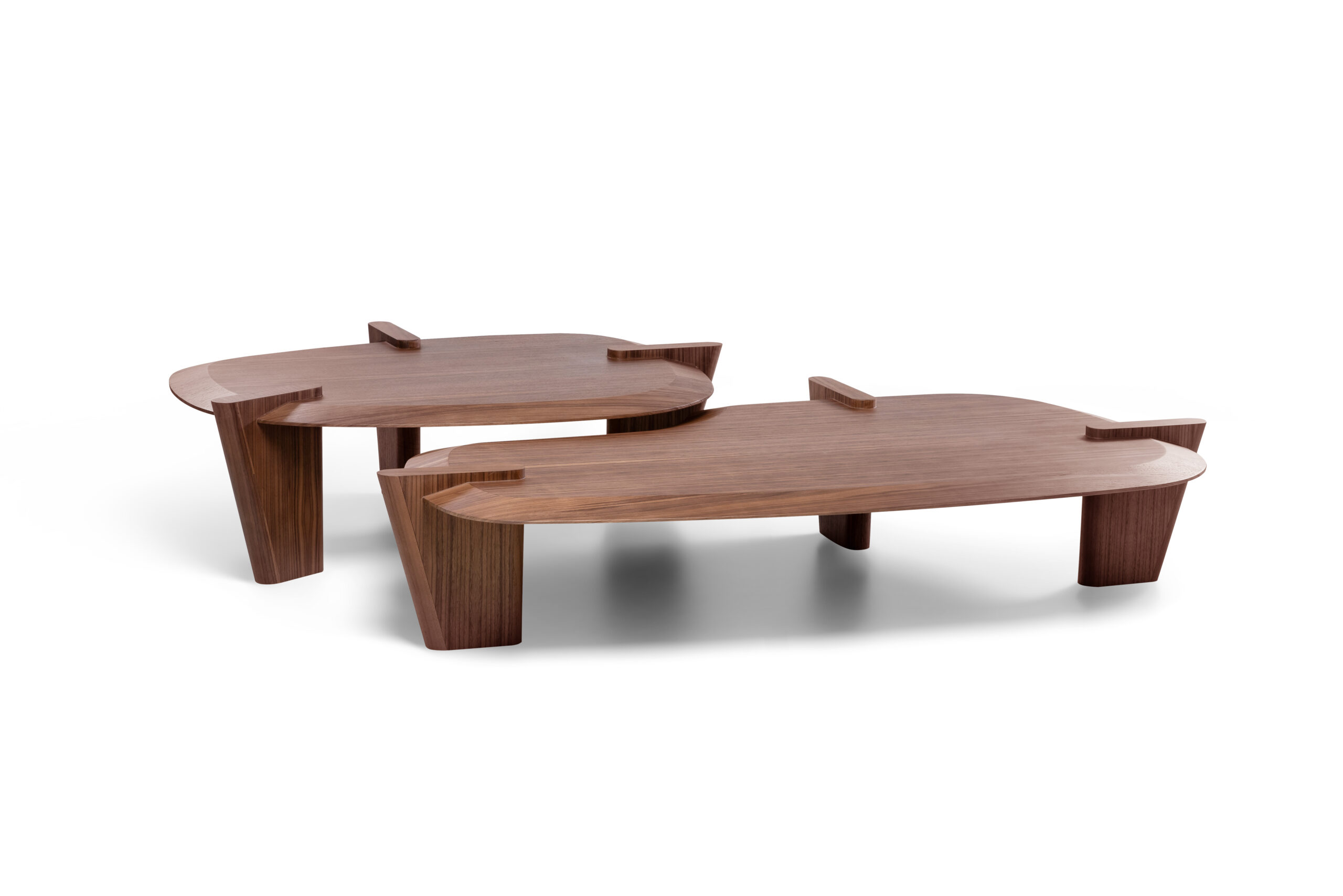 Mesas de centro Harmony con diseños geográficos, elaboradas en madera nogal, disponibles en diferentes medidas que encajan perfectamente entre sí creando una composición armónica y versátil. Un diseño sofisticado que aporta calidez, estilo y dinamismo al espacio.
